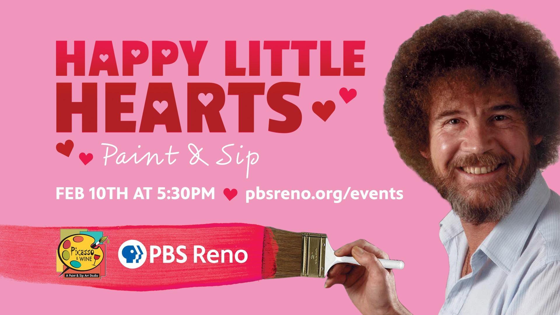 Create your own romantic, Bob Ross–inspired masterpiece at the PBS Reno Happy Little Hearts Paint and Sip! $75/person with all supplies are provided and no experience is needed—just bring your creativity! Space limited to availability.